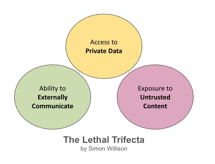 Simon Willison coined the term the Lethal Trifecta for AI Agents in July 2025. He claims that AI agents are, by design, vulnerable since they form an intersection of three capabilities: