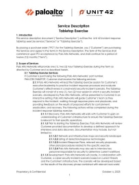 This service description document (“Service Description”) outlines the terms and descriptions for the use of a Unit 42® Tabletop Exercise. The Unit 42 Tabletop Exercise is designed for customer's executive leadership to practice incident response processes and evaluate customer's effectiveness in a real-world security incident scenario.