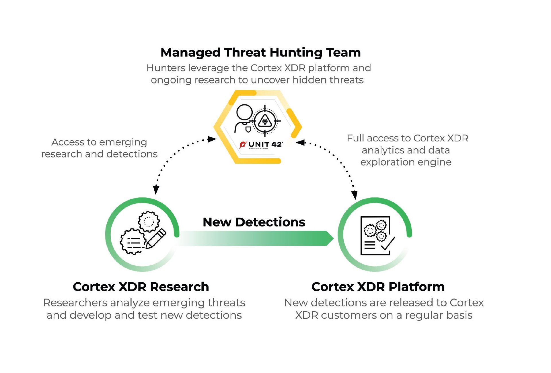 Managed threat hunters have full access to all the analytics and detection rules in the Cortex XDR platform. They use these as high-quality leads to start hunting. They also have access to emerging detectors the Cortex XDR research team is working on, and they can use these detectors before they are rolled into the Cortex XDR platform.