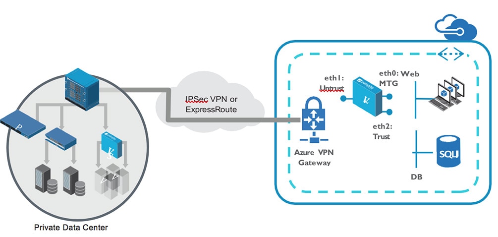 shared infrastructure. An introduction to the Azure VNet can be found here. On the left side of the image is the existing private data center with redundant connectivity to the Azure VNet. In this example, a new, two-tiered application with database and web tiers is deployed in the public cloud. The VM-Series in the VNet is securing the traffic in and out of the VNet, as well as east-west traffic within the VNet, just as the physical firewall in the private data center might do.